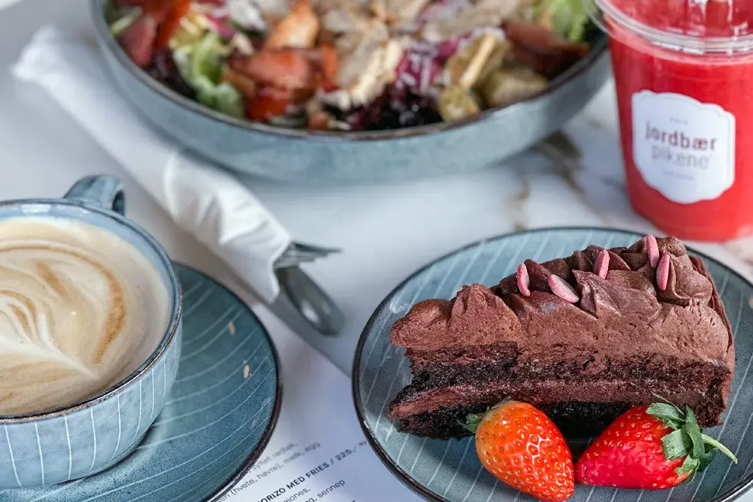 Vi lager både mat og kaker fra bunnen av, med sesongens friske råvarer. Dermed er vi et naturlig møtested for alt fra kaffe og kaker til lunsj og middag. Maten serverer vi med et stolt smil om munnen, og, vi er så fornøyd med oppskriftene våre at vi gjerne deler dem med deg.