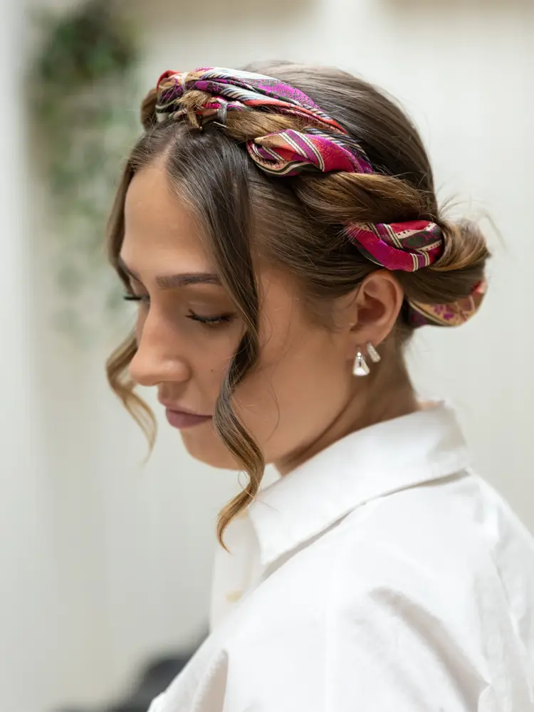 Her har Cecilie tatt utgangspunkt i de samme krøllene, og delt håret i to musefletter. Deretter har hun lagt sjalet med midten bak i nakken, og tvunnet håret sammen med sjalet, en side av gangen. Legg tvinningen langs hodet frem mot panna, og fest godt med spenner. La gjerne et par lokker henge løst, for å vise de fine krøllene.
