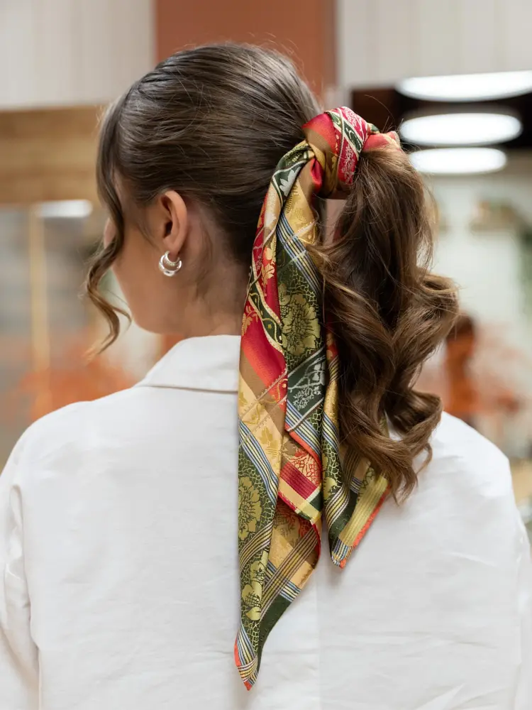 Denne klarer selv de mest utålmodige av oss, og likevel er frisyren både glamorøs og kul. Løse krøller i høy hestehale er flott i seg selv, og når du knyter et tørkle rundt strikken, går du plutselig fra hverdag til høytid. Det fine bunadskjerfet fant vi på Strømmen husflid, men vanlige silketørkler har en stor plass i vårens motebilde, og finnes i et stort utvalg over hele senteret.