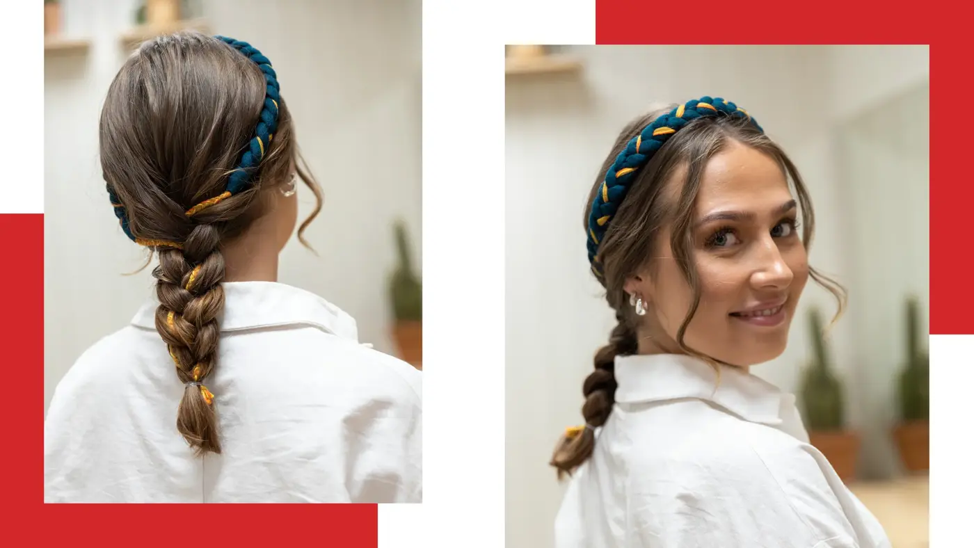 Fest hårbåndet som en hårbøyle, del håret i tre like deler og la hårbåndet bli med i den éne delen. (Dette funker best for deg som har et hårbånd som er tynnere i endene, og kan også gjerne lages med et tynt silkeskjerf eller et bredt sløyfebånd). Lag en helt vanlig flette, og fest i bunnen med en tynn gummistrikk. Dra gjerne fletta litt i bredden for å gi den mer volum.
