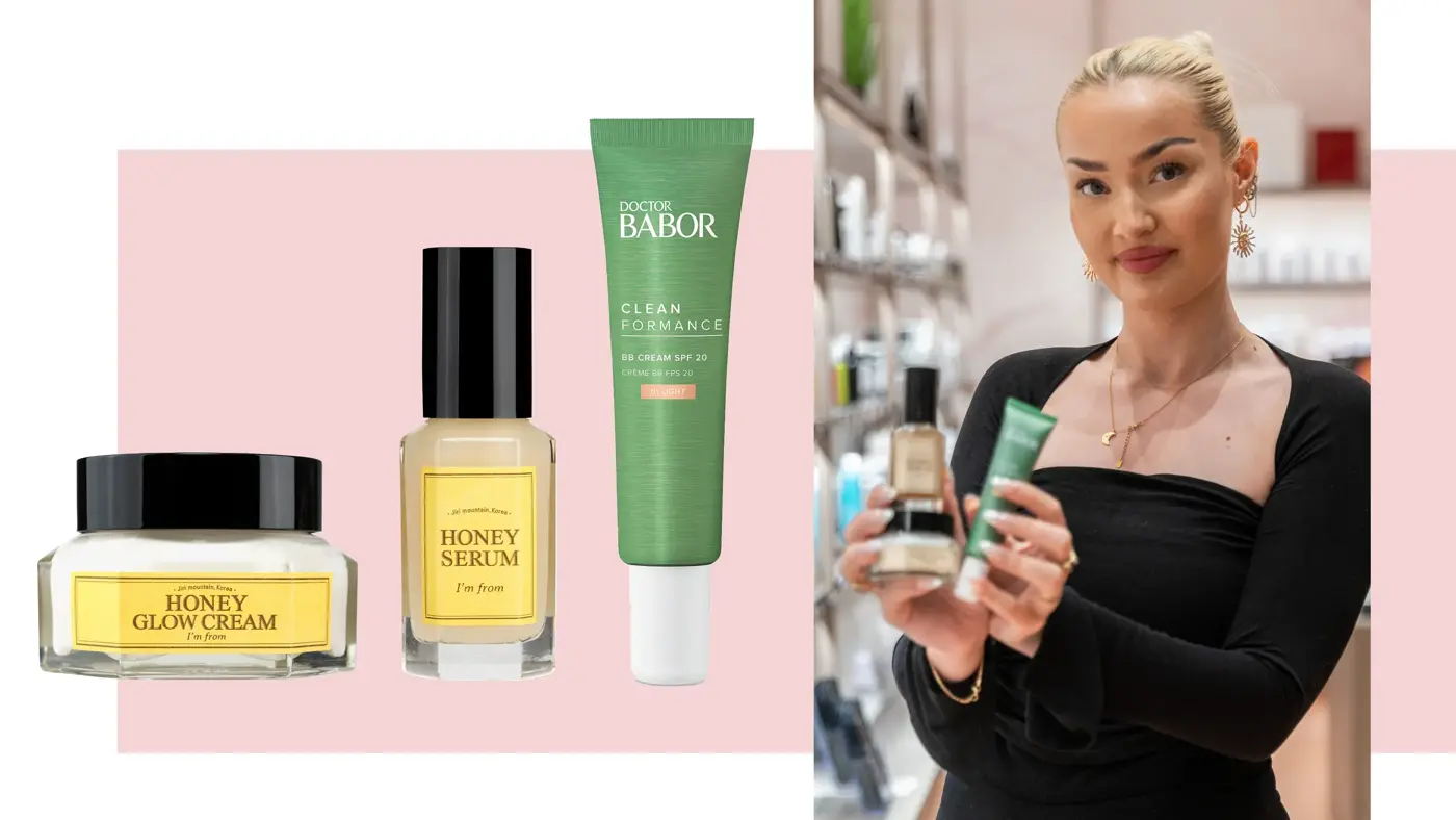 – Jeg går alltid for BB-kremen fra Babor, som både har litt farge og solfaktor 20. Det er en perfekte alt i ett-kremen for meg. For å få ekstra glød i huden i sommer, bruker jeg også Honey serum og Honey glow cream fra I’m from. De er lette og gode på huden, så man slipper bli klissete, og de har dessuten lysreflekterende pigmenter som gjør at du stråler litt ekstra, sier hun.