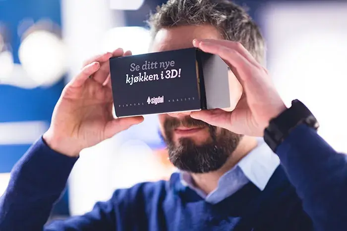 For å få et endelig tilbud, tegnes kjøkkenet av de som jobber hos Studio Sigdal. Det gjør at kjøkkenløsningen kvalitetssikres i alle ledd i tegneprosessen. Når du har fått et tilbud kan du motta bildene på telefonen og se det med butikkens 3D-bilder ved å plassere mobilen i brillene.
