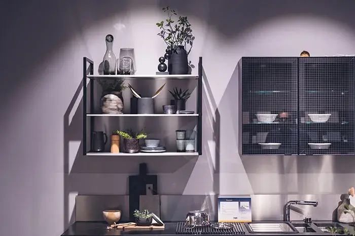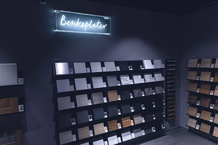 – Vi selger alt fra selve kjøkkenet og hvitevarer til hyller, servanter og benkeplater. Vi ser at overskap er mindre populært enn tidligere og kundene ønsker mer luft og åpne hyller over benken. Hyllene vi fører kan du få i samme materiale som det du kjøper benkeplaten i. Det er mange valg du kan ta for å få et skreddersydd og personlig kjøkken, forklarer Lasse