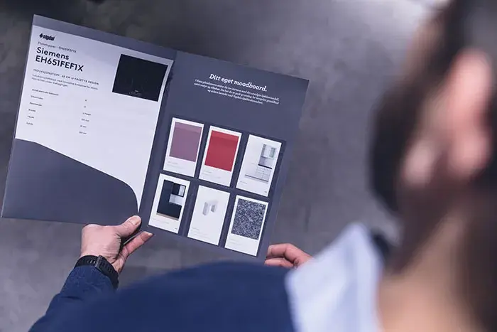 På skjermer rundt i lokalet kan du bla deg gjennom produkter som for eksempel hvitevarer. Den ene skjermen gir deg full oversikt over hvilke induksjonstopper du kan velge i, enten du går for en normal topp på 60 cm eller ønsker en bredere variant på 80 cm.