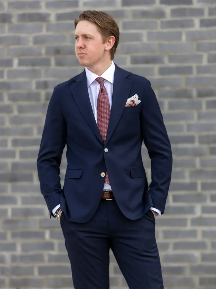 Det blir aldri feil med en mørk blå dress, og kombinasjonen med klassisk, hvit skjorte og slips med røde detaljer, er uslåelig til 17. mai. Skal du i konfirmasjon eller bryllup, kan du nesten ikke kjøre safere.