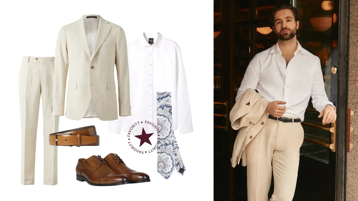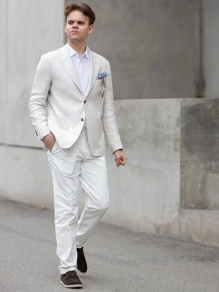 Her er den lyse blazeren kombinert med en klassisk, hvit skjorte og mørke loafers, og med hankie som et moteriktig alternativ til slips.