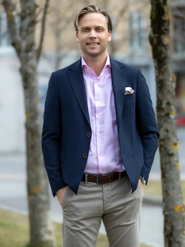 – Denne dressen fra Oscar Jacobson ligger på det mellomblå, mot mørk, og er superfin utenpå en klassisk hvit skjorte. Her har vi stylet med rødt slips med mønster, og et tørkle som tar opp fargene både fra skjorte og slips, sier Aleksander hos Follestad.