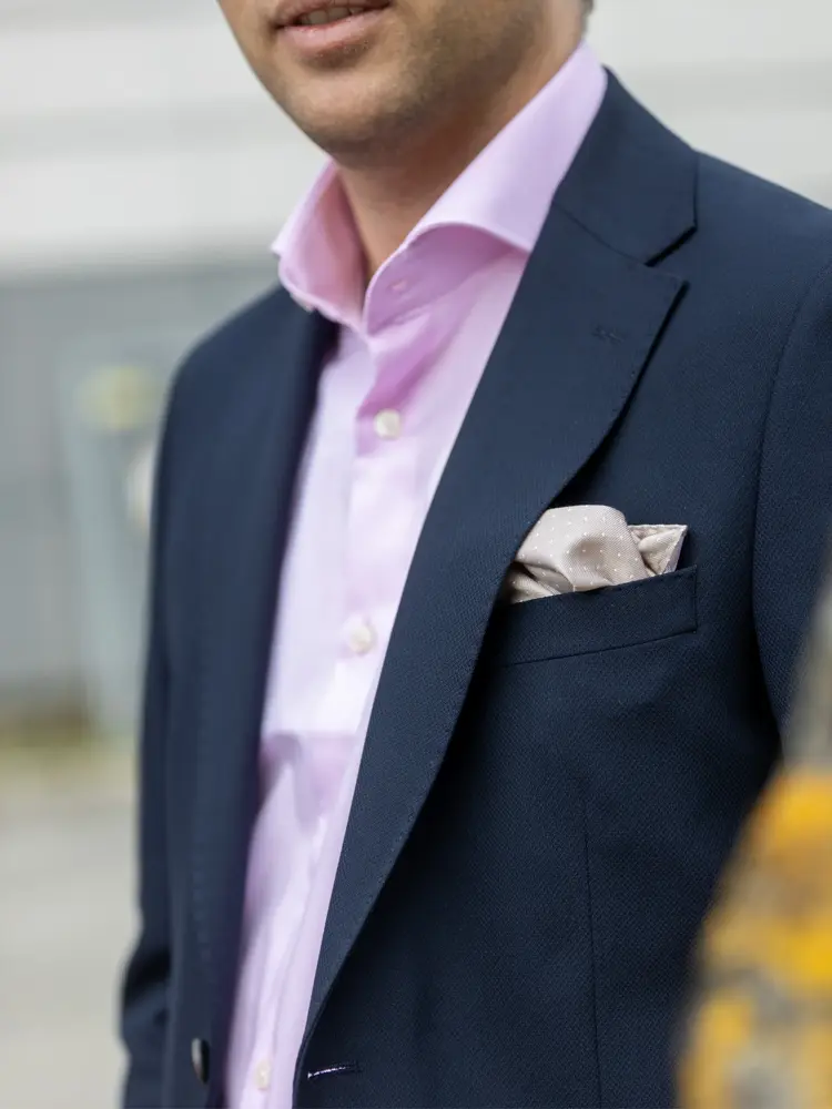– Et trygt valg med hvit eller lyseblå skjorte, men også utrolig fin i kombinasjon med denne rosa skjorta i egyptisk bomull. Et litt sprekere valg, som gjør seg spesielt godt på sommerens fester, me-ner han.