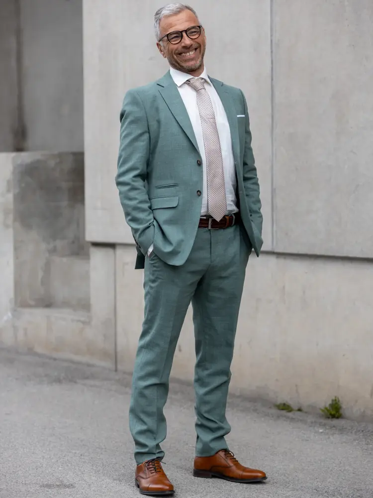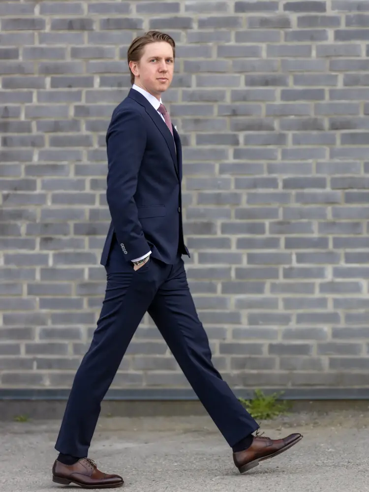 Aleksander anbefaler å velge en dress med litt tekstur i stoffet, som gjør det enklere å kombinere med andre farger.