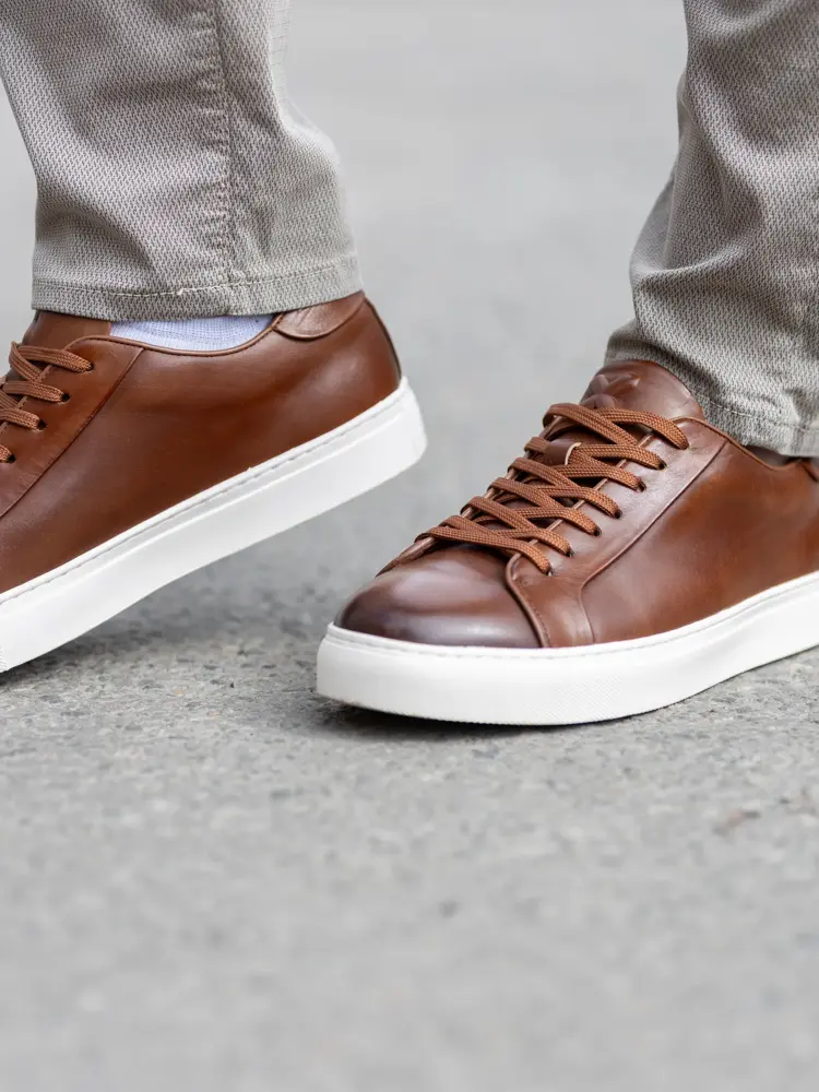 Til antrekket har Alexander valgt et par brune sneakers og et brunt belte.