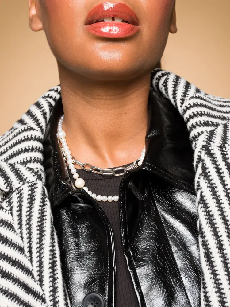 Om sesongen blir for kort for den tynne skinnjakken, kan den gjerne brukes som overskjorte under kåpen din. (Denne er i vegan skin, forresten.) Jakke fra Meotine/Høyer, kr 3299,-. Kul kombinasjon av klassiske og røffere detaljer, med perler og en kraftig sølvlenke rundt halsen. Perlekjede fra Thune, kr 5.595,- // sølvkjede fra Thune, kr 2.745,-