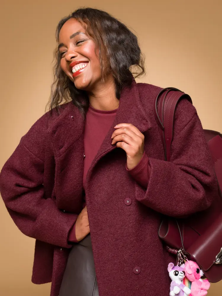 Sjekk silhuetten – en boxy jakke over et legglangt klokkeskjørt. Burgunder og sjokoladebrunt er to av høstens hotteste nyanser, og vi digger det. Jakke fra Marie Philippe, Match, kr 1.999,- // Skinnskjørt fra Envelope 1976, Me & My Cousin, kr 8.999,- // Boots fra Unified, Grændsen Skotøimagazin, kr 999,-