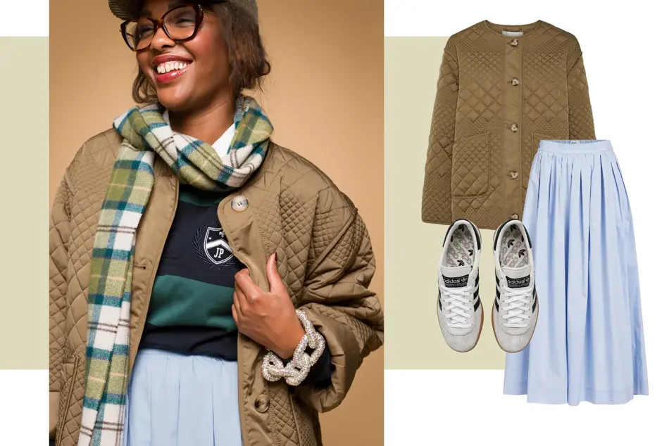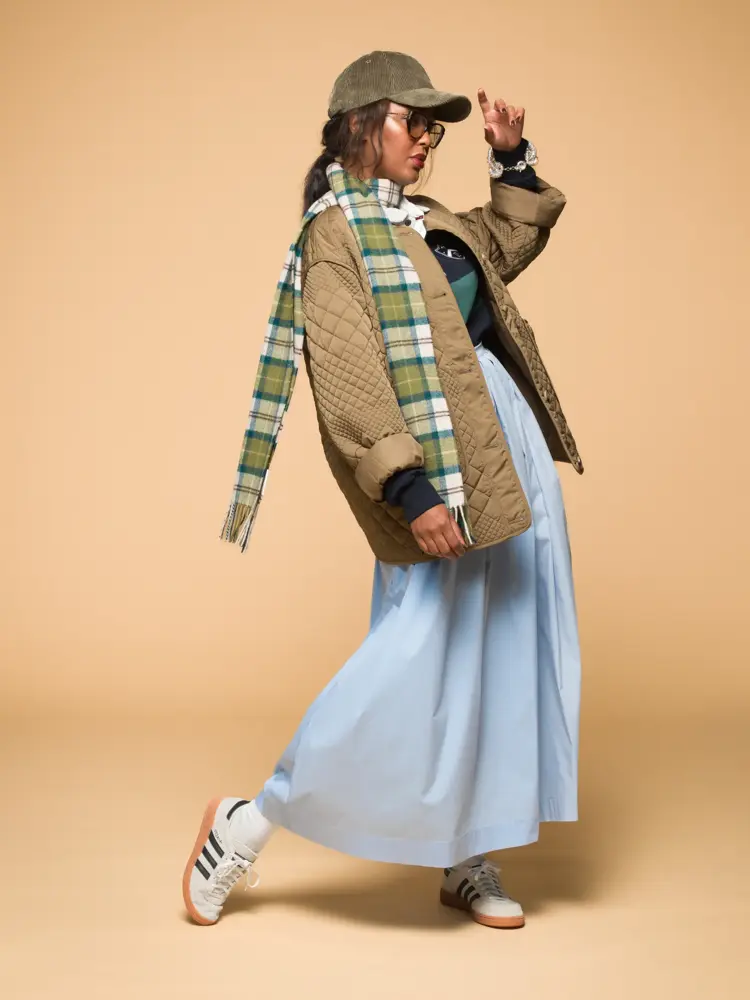 Den vatterte jakka er overalt i høst, her i en romslig og anvendelig variant. Det lange klokkeskjørtet er vårt nye go to, og kan enkelt dresses opp eller ned. Her i kombinasjon med en klassisk genser med krage og sporty sneakers. Genser fra Jean Paul, Match, kr 1.399,- // blått skjørt fra Object, Olivias Verden, kr 998,- // rutete skjerf fra Babor, Follestad, kr 699,- // caps fra Jean Paul, Match, kr 499,- // jakke fra Yas, Olivias Verden, kr 1.199,- og sko fra Adidas, Foot Locker, kr 1.199,-