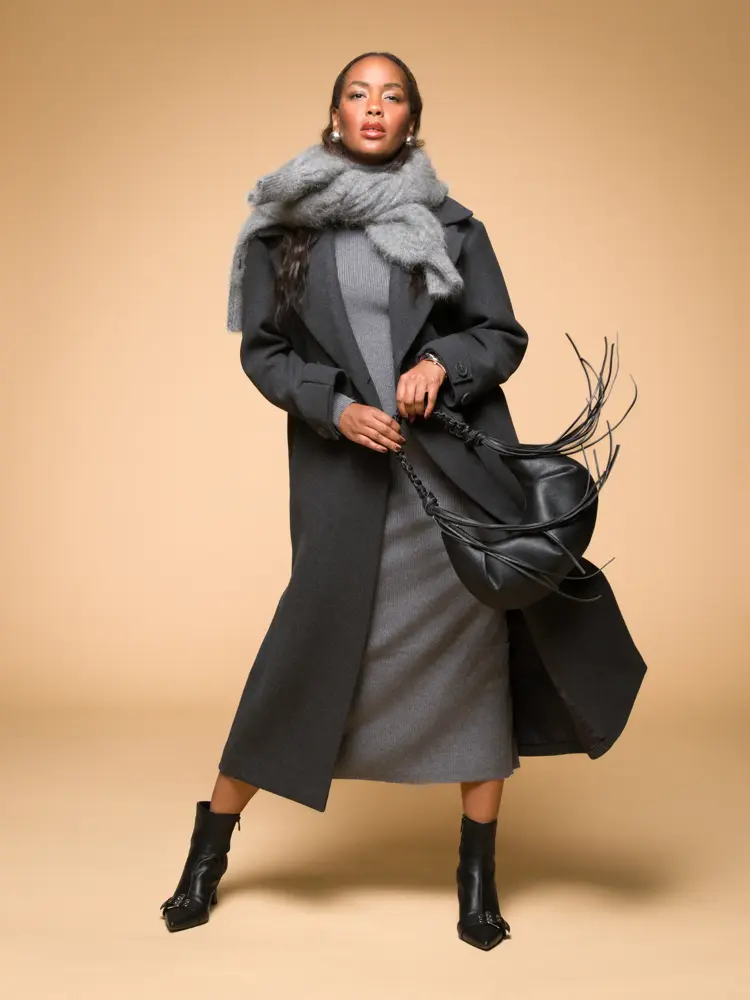 Fine frynser! Enkel, grå kjole fra Cubus, kr 599,- som er super å dresse opp. Kåpe, også Cubus, kr 1.299,- og veske med frynser fra Holzweiler, Me & My cousin, kr 2.499,- // sko med spenne fra Clark, Din Sko, kr 599,-