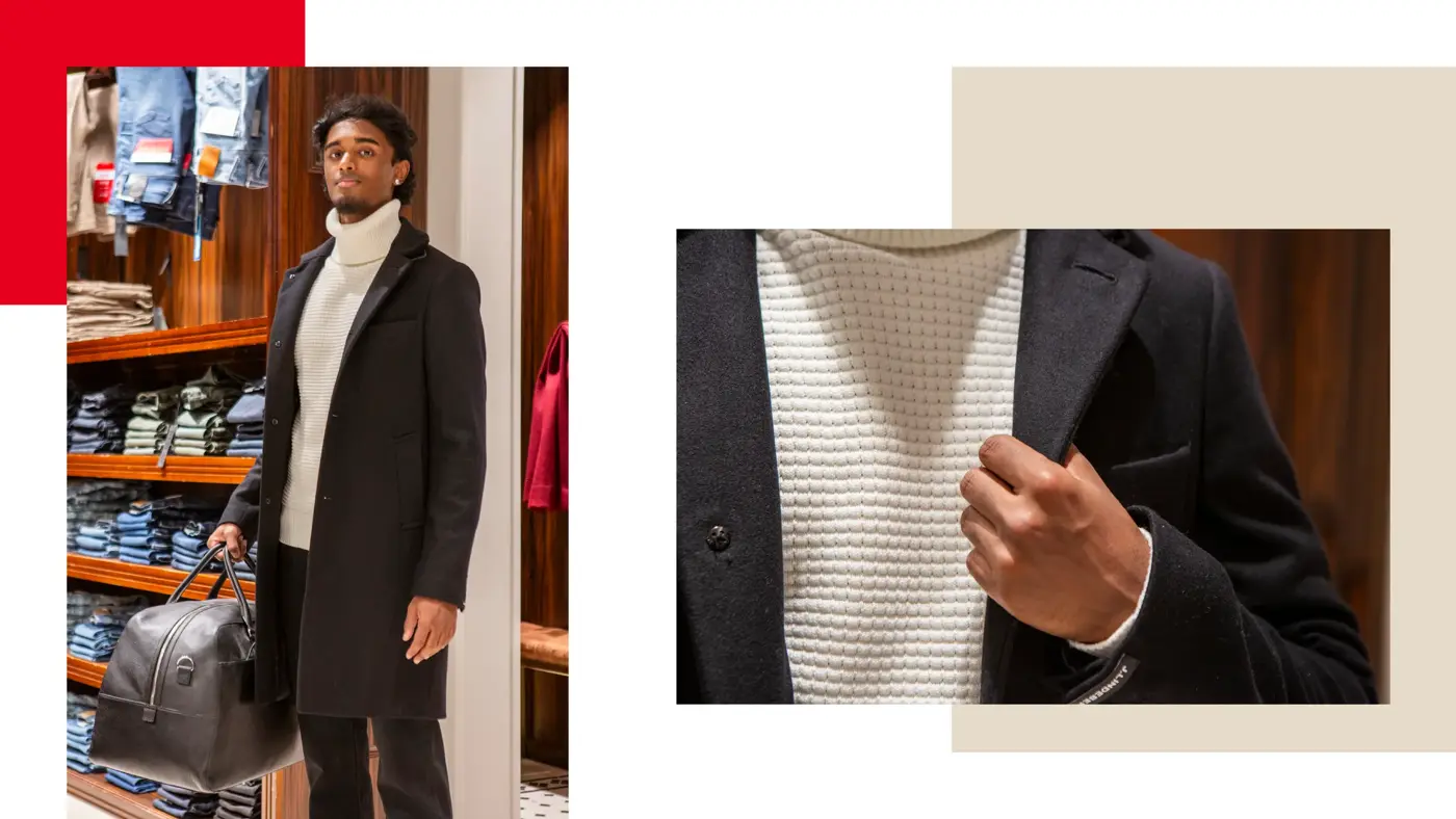 Jeg ser flere sverger til en god ullfrakk over både dressen og en genser. Da kan genseren være alt fra half-zip til en turtleneck, en høyhalset genser. Frakken og genseren jeg bruker her er fra J. Lindeberg.
