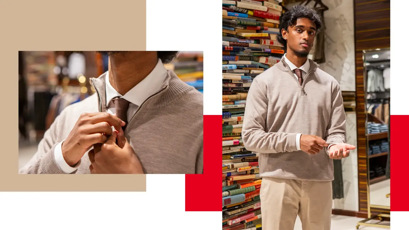 Butikkmedarbeider hos Volt, Venthan, pakker seg inn i turtlenecks og half-zips når kulden kommer, og lar lune ullplagg myke opp det formelle uttrykket dressen gir.