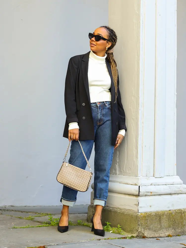 En blazer kan du også style med jeans, i stedet for den mer tradisjonelle draktbuksen.