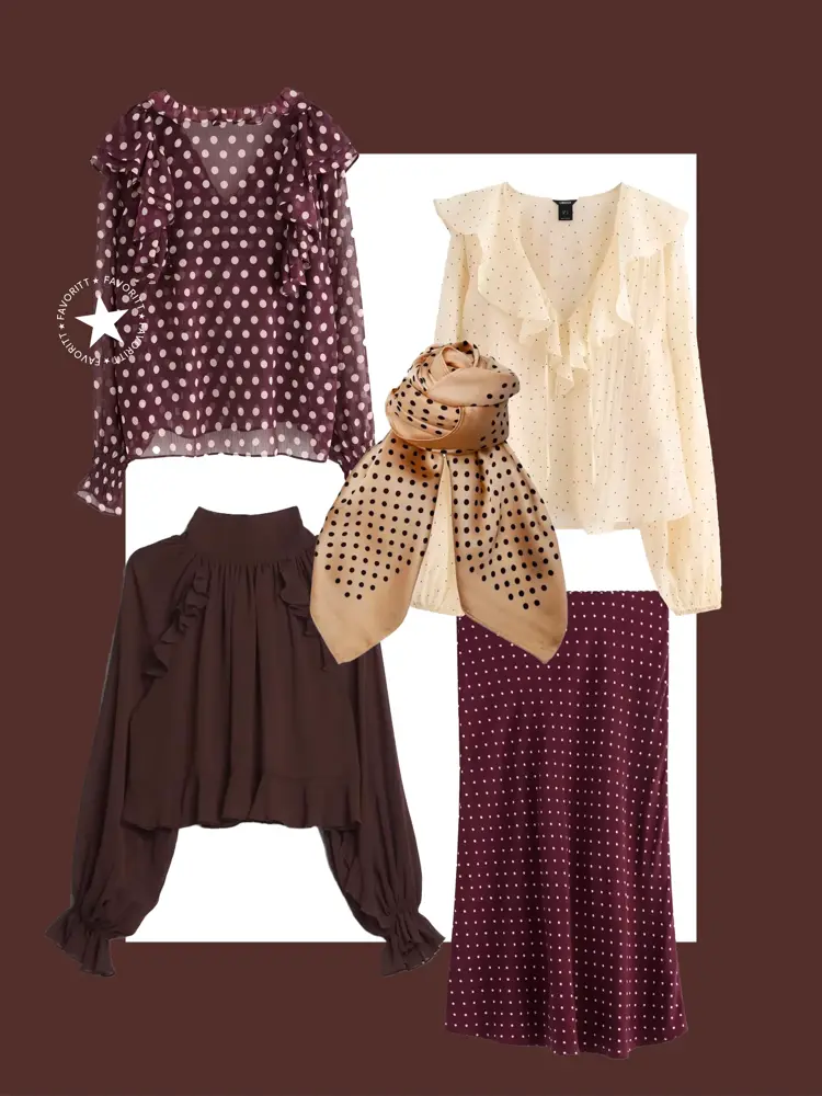 Polkadottene gjør seg like godt småmønstret på chiffon og silke, som stort og dominerende, og varierer i høst fra den tradisjonelle, svart-hvite til en mer moderne kombinasjon i lavendel, burgunder, olivengrønn og jordfarget.