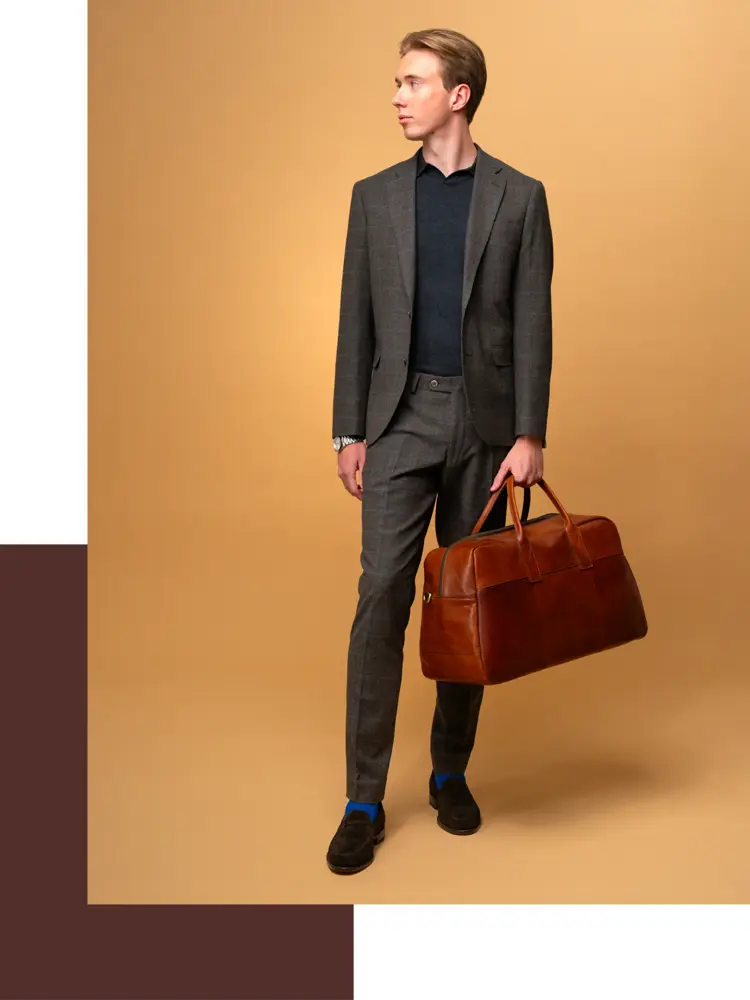 Kul på kontoret? Her har stylisten hentet opp fargen fra rutemønsteret på sokkene, som gir et moderne og lekent uttrykk til et ved første øyekast klassisk antrekk. Dress og genser fra These Glory Days hos Volt, sokker fra HM, sko fra Volt og weekendbag fra Volt