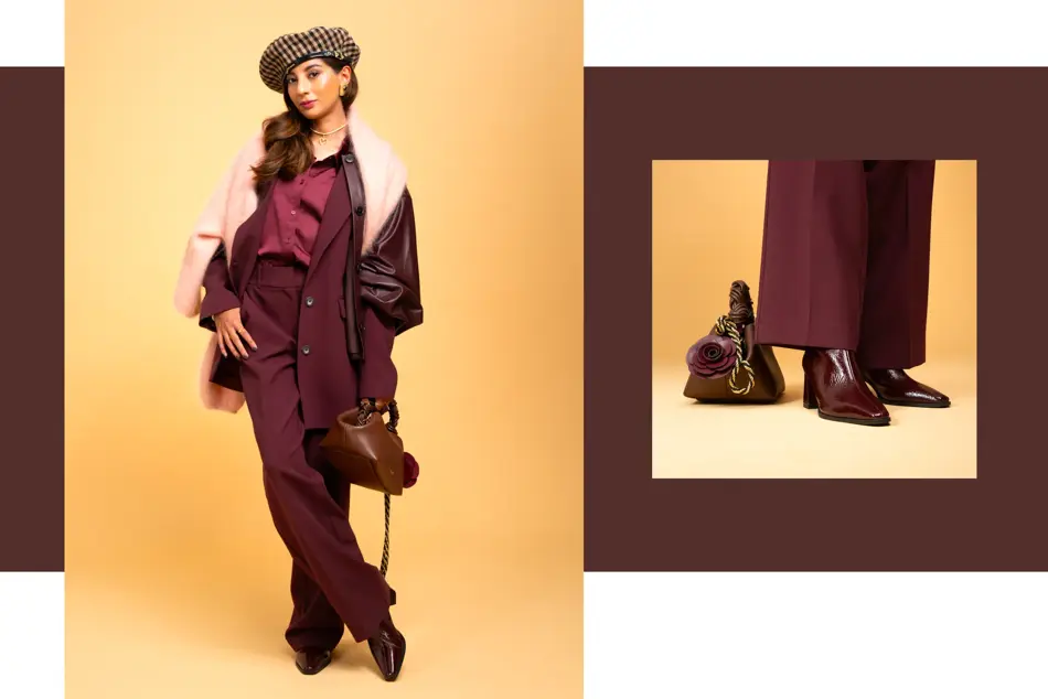 Vi digger helfargede antrekk og ton-i-ton – gjerne med en liten knekk i fargekoden, som den pastellrosa kardiganen over skuldrene. Dress fra Selected hos Olivia’s verden, skinnjakke fra Lindex, rosa cardigan fra Ella & Il hos Me & My Cousin, bluse fra Vila hos Olivia’s verden, boots fra Unified hos Grændsens Skotøimagazin, veske og beret fra Ganni hos Follestad. Vesken er pyntet med rose fra Lindex og kjede fra Fretex. Halskjede og ringer er fra Maanesten hos Høyer og øredobber fra Fretex.