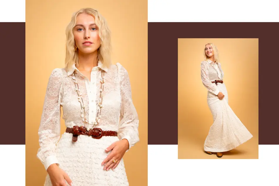 Raffinert boho, kaller stylisten denne looken – en aldri så liten oppgradering fra sommerens bohemske og flowy trend. Kjolen er mer strukturert og bearbeidet enn de løse sommerkjolene, men har beholdt lettheten. Kjør på med perler, kjeder og store anheng, og kombiner med støvletter. Kjole fra By Timo hos Me & My Cousin, sko fra Fretex, belte fra Carla Jade hos Me & My Cousin, solbriller fra Olivia’s verden, pelsvest fra Envelope1976 hos Me & My Cousin, veske fra Carla Jade hos Me & My Cousin og halssmykke fra Fretex