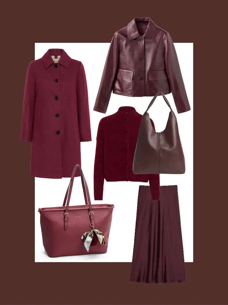 Dyp burgunder hentet vi frem fra glemselen i fjor, og i høst er fargen å finne i nær sagt alle butikker. Sjekk bare kåpe fra Part Two hos Companys, skinnjakke fra Mango, burgunder strikkejakke fra Gestuz hos Companys, veske i kunstlær fra Kappahl, satengskjørt fra Lindex og skinnveske fra Bagorama.