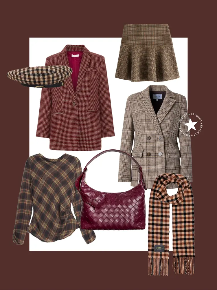 Ruter dame. Enten du går for tartan, hundetann eller bonderuter – i år er det ruter på alt! Beret fra Ganni hos Follestad, burgunder rutet blazer fra Ny & Ne, skjørt fra Lindex, lys rutet blazer fra Vic, bluse fra Bik Bok, veske fra Glitter og skjerf fra Ganni hos Follestad
