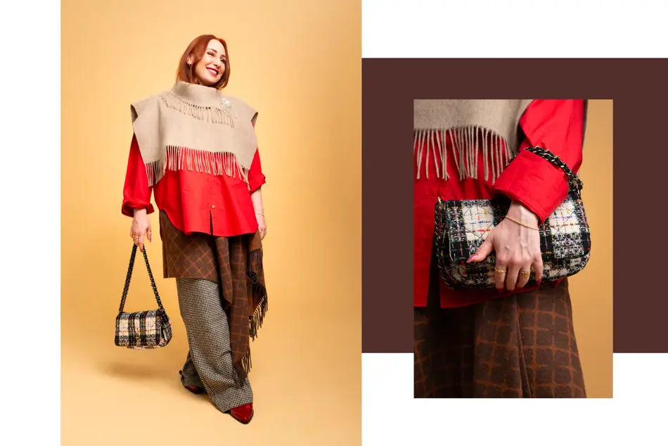 De fleste av oss har ruter i garderoben, og dersom du ikke har, er dette sesongen for å skaffe deg det. Nå florerer det, både til dame og herre, og i alt fra avslappet flanell til skarpe detaljer. Kombiner gjerne flere ulike rutemønstre – også kult som lag på lag. Sjal fra Høyer, brosje fra Pearl Octopussy hos Me & My Cousin, bukse fra Lindex, skjorte fra By Malene Birger hos Høyer, skjerf rundt livet fra By Malene Birger hos Høyer, sko fra Shoeday og veske fra Becksöndergaard hos Olivia’s verden. Alle smykker er fra Glitter