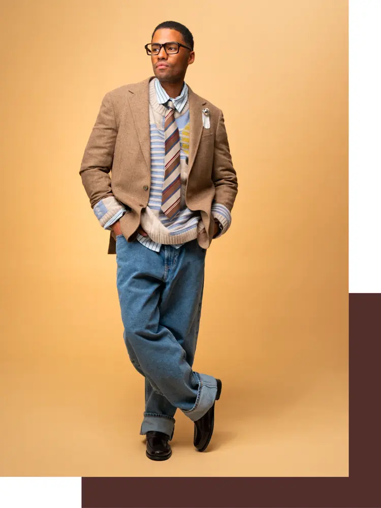 Komfy street mikset med elementer av en mer dresset look i høstens kuleste stil for gutta. Legg merke til det brede slipset og brosja på dressjakka. Blazer fra Polo hos Volt, skjorte fra Samsøe Samsøe hos Høyer, genser fra Holzweiler hos Høyer, slips fra These Glory Days hos Volt, briller fra Brilleland, sko fra Stockholm Design Group hos Grændsen Skotøimagazin, jeans fra Junkyard og brosje fra Olivia’s verden.