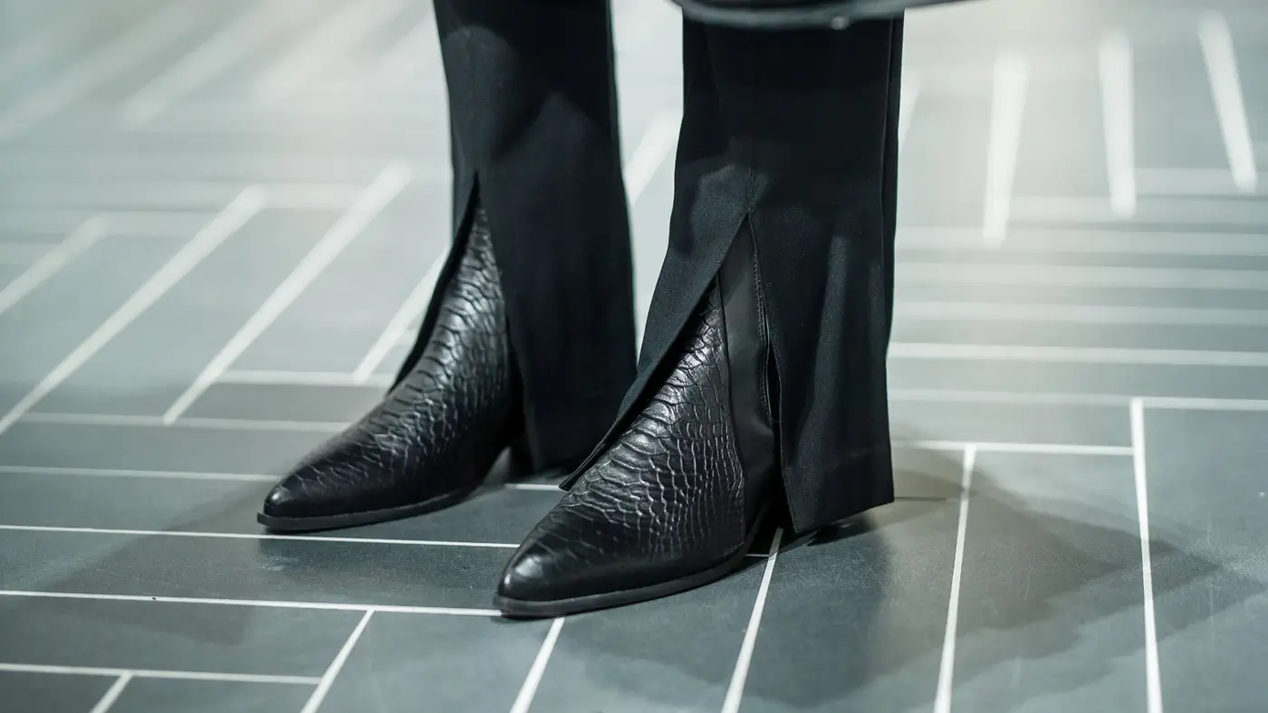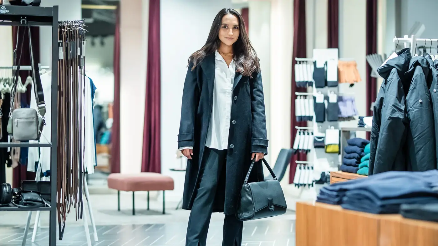 Sorte boots fra Pavement, Companys, kr 1599 // Sort dressbukse fra Samsøe, Companys, kr 1299 // Hvit skjorte fra In Wear, Companys, kr 900 // Sort ullkåpe fra In Wear, Companys, kr 2400 // Halskjede, Companys, kr 349 // Ring, Companys, kr 775 // Veske fra Markberg, Companys, kr 2999 //