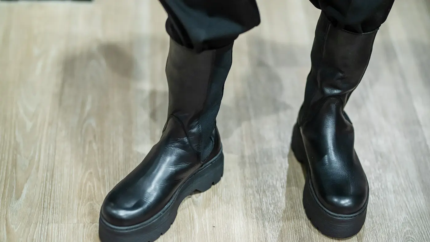 Chunky boots fra Pavement, Message, kr 1699,95 // Rutete jakke fra Dahrling, Message, kr 1550 // Grå hettegenser fra Project Unknown, Message, kr 450 // Svart dressbukse fra Mbym, Message, kr 950 //