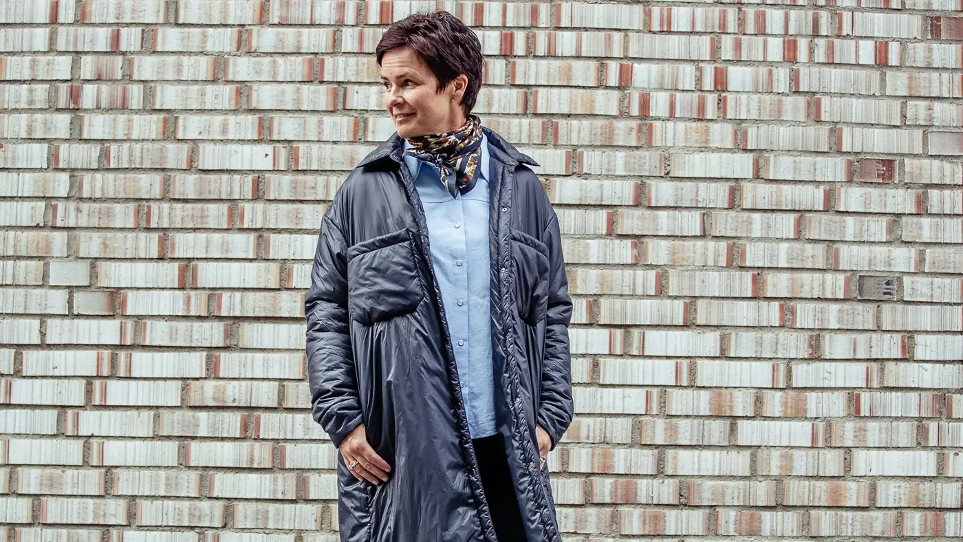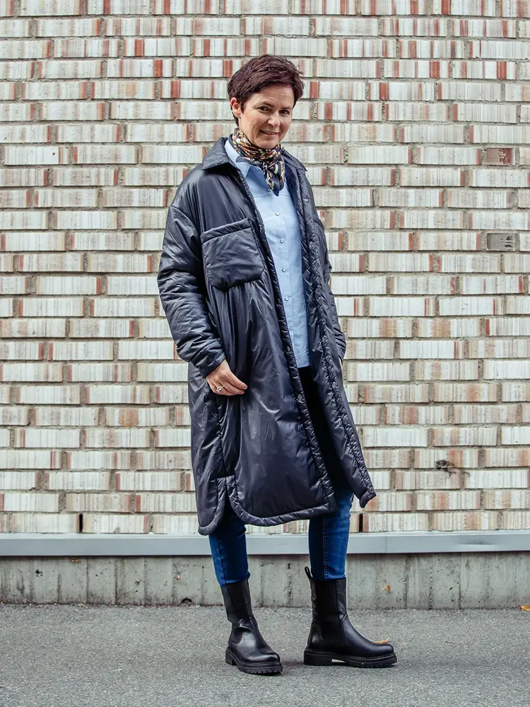 – Ruter er ett av de hotteste mønstrene på skjerf og ytterplagg denne høsten, hvorfor ikke gå for det på høstkåpen? Jeg syns denne kåpen er særegen, røff og sporty. Den er varm og enkel å style, gjerne til et par skinnbukser eller noen røffe jeans. Vil du ta den helt ut, kan du mikse ruter og bruke et fargerik Holzweiler-skjerf til kåpen.