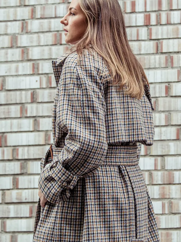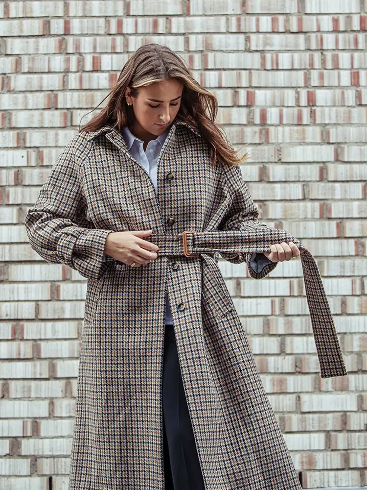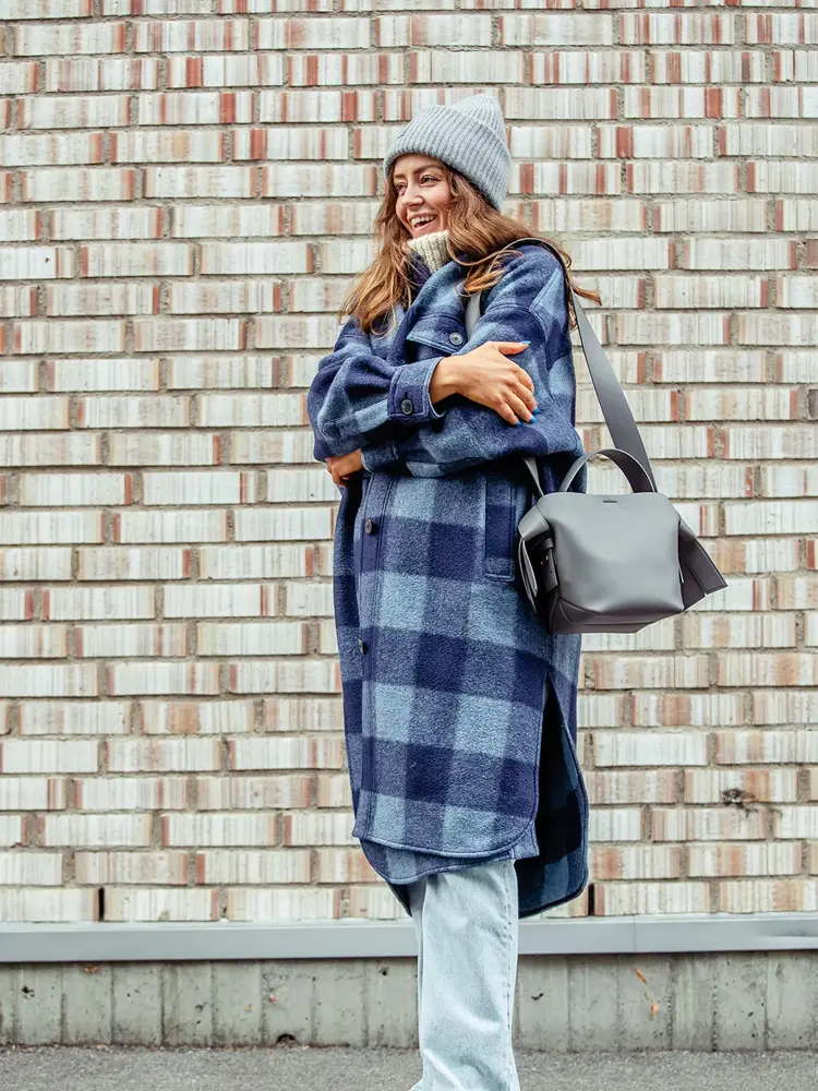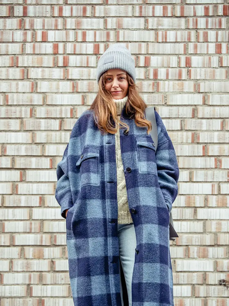 – Jeg valgte denne kåpen fordi den skiller seg litt ut fra andre høstkåper. Den er lang, oversized og har et fresht rutemønster og kule detaljer. Den kan styles med tøffe boots, et par solbriller og med en skulderveske til, eller med sneakers. Lukk den med kun knappene for en mer casual og avslappet stil, eller velg et mer klassisk og elegant uttrykk ved å bruke beltet i livet. Vi ser flere lange kåper denne høsten og det passer sesongen bra. Det er flere teksturer og velge i, men ruter går igjen på flere av kåpene.