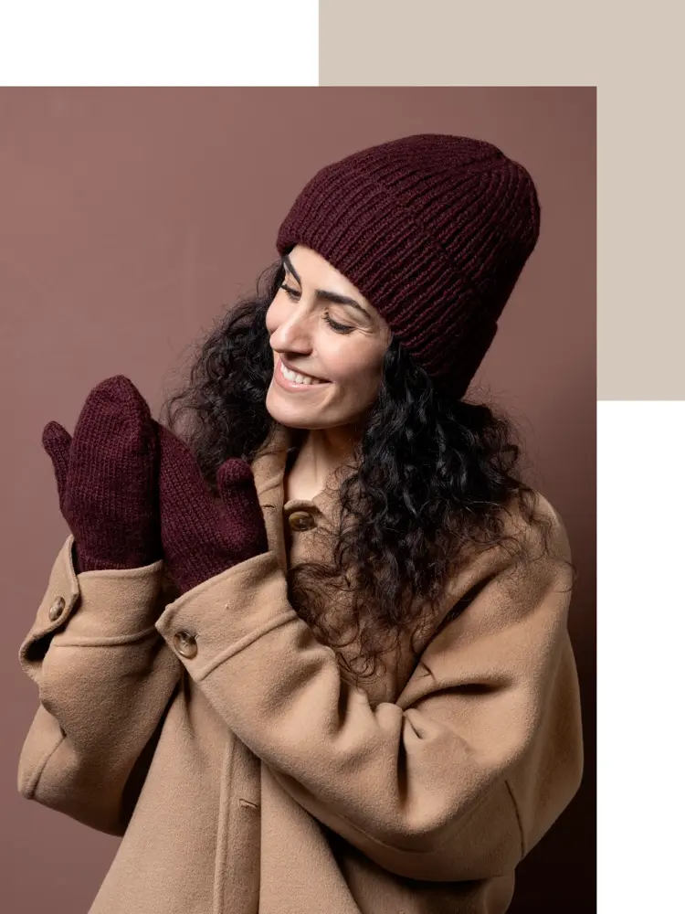 Den perfekte gaven til alle fryser, eller ikke liker å gjøre det. Nydelig, mykt sett med lue og vanter – og denne har vi strikket i årets mest trendy farge.
