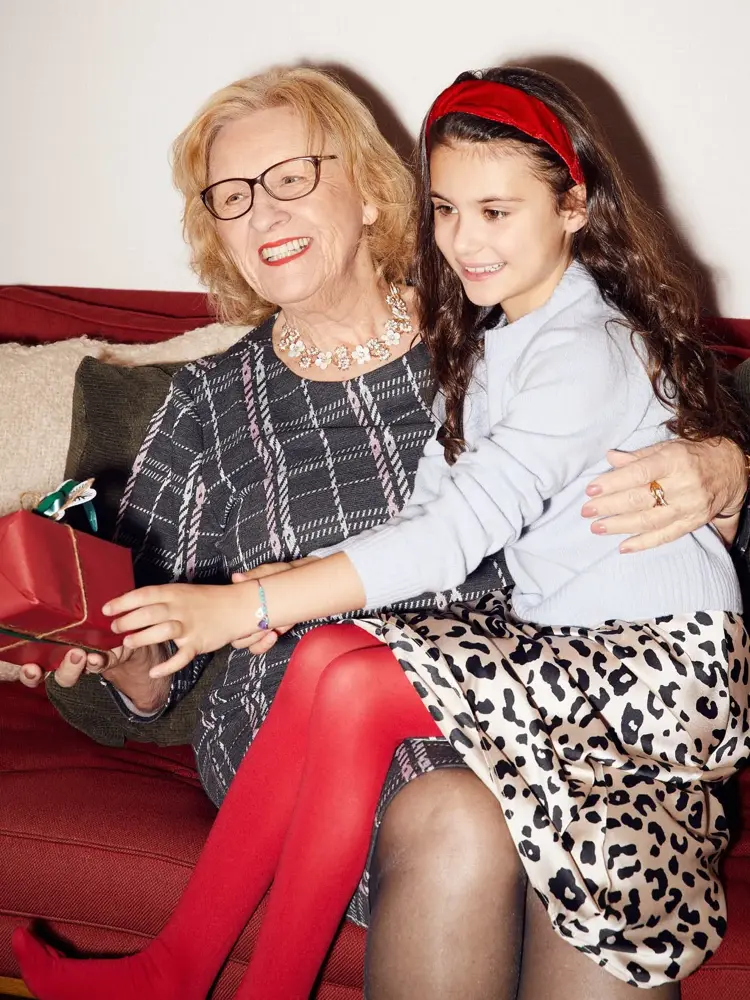 Bestemor: Kjole fra BTX/Stili, kr 799,-// Strømper fra Lindex 129,-// Klokke fra Skagen/Gullfunn, kr1295,-// Smykke fra Accessorize, kr 249,-