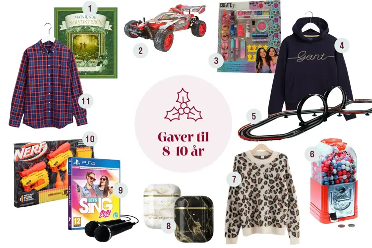 1.Solvokteren av Maja Lunde fra Ark, kr 399,-// 2.Fjernstyrt bil fra Lekia, kr 699,-//3.Sminkesett fra Ringo, kr 399,-//4.Hoodie fra Gant, kr 890,-//5.WRC Rallybanefra Ringo, kr 999,-//6.Tyggismaskin fra Teknikkmagasinet, kr 249,-//7.Strikketgenser fra Lindex, kr 299,-//8.Etui fra AirPods fra iDeal of Sweden/Clas Ohlson, kr299,90,-per stk //9.Let ́s Sing 2021 fra Playstation/Elkjøp, kr 599,-//10.Nerf fraRingo, kr 349,-//11.Skjorte fra Gant, kr 790