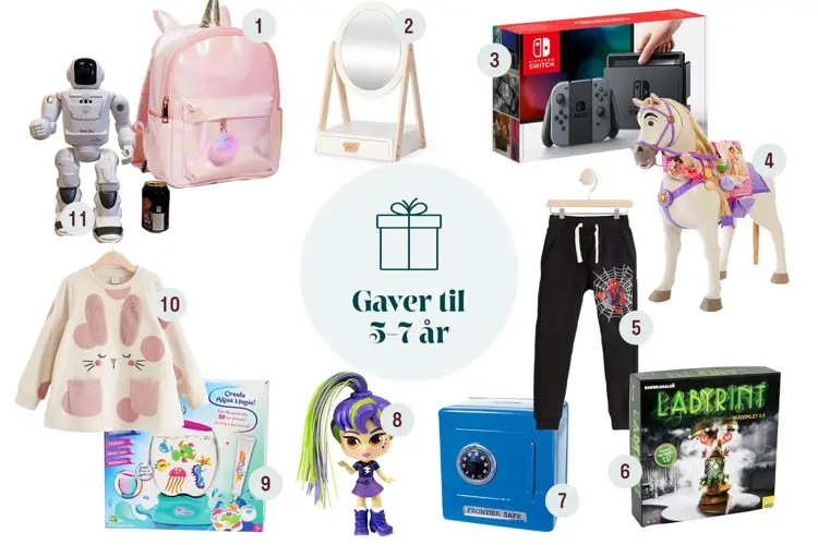 1.Sekk fra Glitter, kr 199,-//2.Bordspeil fra Ringo, kr 499,-//3.Nintendo Switch fraNintendo/Eljøp,kr 3390,-//4.Hest til å sitte på fra Maximus/Ringo, kr 1299,-//5.Joggebukse fra Lindex, kr 199,-//6.Labyrint brettspill fra Ark, kr 379,-//7.Sparebørse fra Teknikkmagasinet, kr 149,-//8.Dukke fra Curly Girlz/Lekia, kr 179,-//9.Aqua Debrafra Lekia, kr 399,-//10.Tunika fra Lindex, kr 199,-//11.Robot fraRingo, kr 599