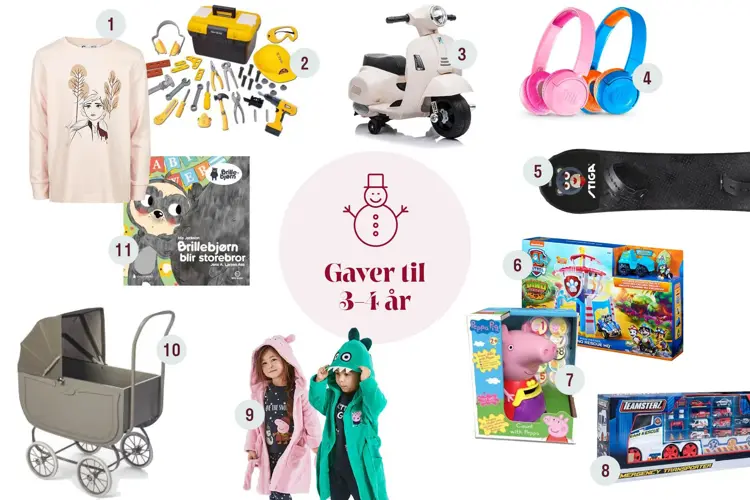 1.Genser fra Cubus, kr 179,-//2.Verktøysett fra WRK/Lekia, kr 449,-//3.MiniVespa fra Ringe, kr 999,-//4.Hodetelefoner fra Teknikkmagasinet, kr 499,-per stk //5.Snowboard for nybegynneren fra Stiga/Ringo, kr 299,-//6.Paw Patrol jungle fraRingo, kr 799,-//7.Peppa tell og lær fra Ark, kr 499,-//8.Redningsbil med biler fraTeamster/Ringo, kr 399,-//9.Badekåpe fra Nate it, kr 329,95,-//10.Gammeldagslekevogn fra Ringo, kr 1599,-//11.Brillebjørn blir storebror fra Norli, kr 157
