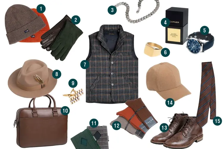 1.Luer fra Lexington, kr 595,-//2.Hansker fra Hestra/Follestad, kr 799,-(brun), 899,-(grønn) //3.Armbånd fra Thune, kr 835,-//4.Parfyme fra Carner Barcelona/Fredrik &Louica, kr 1595,-//5.Klokke fra Armani/Juvelen, kr 3195,-//6.Ring fra Felix/Bjørklund, kr298,-//7.Vest fra Stenstrøms/Høyer, kr 3399,-//8.Hatt fra Bertoni, kr 899,-//9.Mansjettknapper fra Gullfunn, kr 6999,-//10.Skinnveske fra Tiger of Sweden/Volt, kr 3499,-//11.Kortholdere fra Exentri/Condo, kr 499,-//12.Cashmeresokker fra Falke/Høyer, kr219,-//13.Sko fra Ecco/Skoringen, kr 2099,-//14.Caps fra Varsity/Follestad, kr 900,-//15.Slips fra Bertoni, kr 499,-