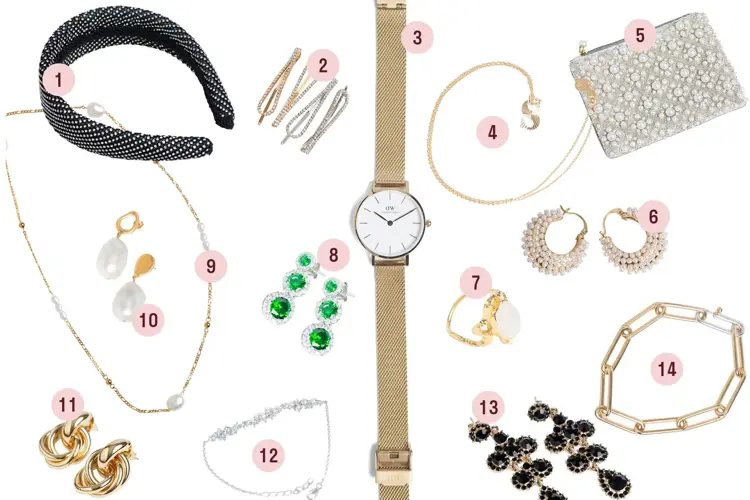 1.Hårbøyle fra Beck Søndergaard/More Than Shoes, kr 349,-// 2.Hårspenner fraAccessorize, kr 119,-// 3.Klokke fra Daniel Wellington/Bjørklund, kr 1399,-// 4.Anheng fraJane Koenig/Høyer, kr 499,-//5.Perleveske fra Accessorize, kr 150,-// 6.Øredobber fraGlitter, kr 139,-// 7.Ring fra Månesten/Høyer, kr 899,-//8.Øredobber fra Magi/Bjørklund,kr 698,-//9.Kjede fra Pan Jewllery x Janne Formoe/Gullfunn, kr 1599,-// 10.Øredobber fraEnamel/Message, kr 1100,-// 11.Øredobber fra Orelia London/Olivias Verden, kr 499,-// 12.Armbånd fra Pan Jewellery/Juvelen, kr 1599,-// 13.Øredobber fra Lily & Rose/Me & MyCousin, kr 900,-// 14.Armbånd fra TiSento/Thune, kr 2698