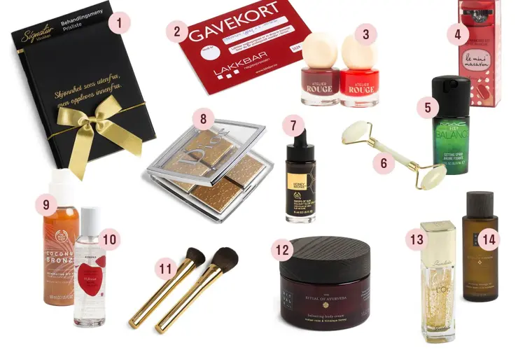 1.Gavekort fra Signaturklinikken, pris etter eget ønske // 2.Gavekort fraLakkbar, pris ettereget ønske // 3.Neglakker fra Atelier Rouge/KICKS, kr 99,-per stk // 4.Manikyrsett fra LeMini Macron/Vita, kr 499,-// 5.Setting spray fra Mac/KICKS, kr 99,-//6.Jade Roller fraKICKS, kr 159,-//7.Shimmering Dry Oil fra The Body Shop, kr 298,-//8.Øyenskygge fraDior/Fredrik & Louisa, kr 470,-// 9.Drops of Sun fra The Body Shop, kr 269,-//10.Face mistfra Korres/Vita, kr 299,-// 11.Sminkebørster fra Beauty Art/KICKS, kr 249,-og 299,-// 12.Balancing Body Cream, Ritual of Ayurveda fra Rituals, kr 195,-// 13.Primer fraGuerlain/Fredrik & Louisa, kr 720,-// 14.Massasjeolje, Rituals of Hamam fra Rituals, kr 150,,-