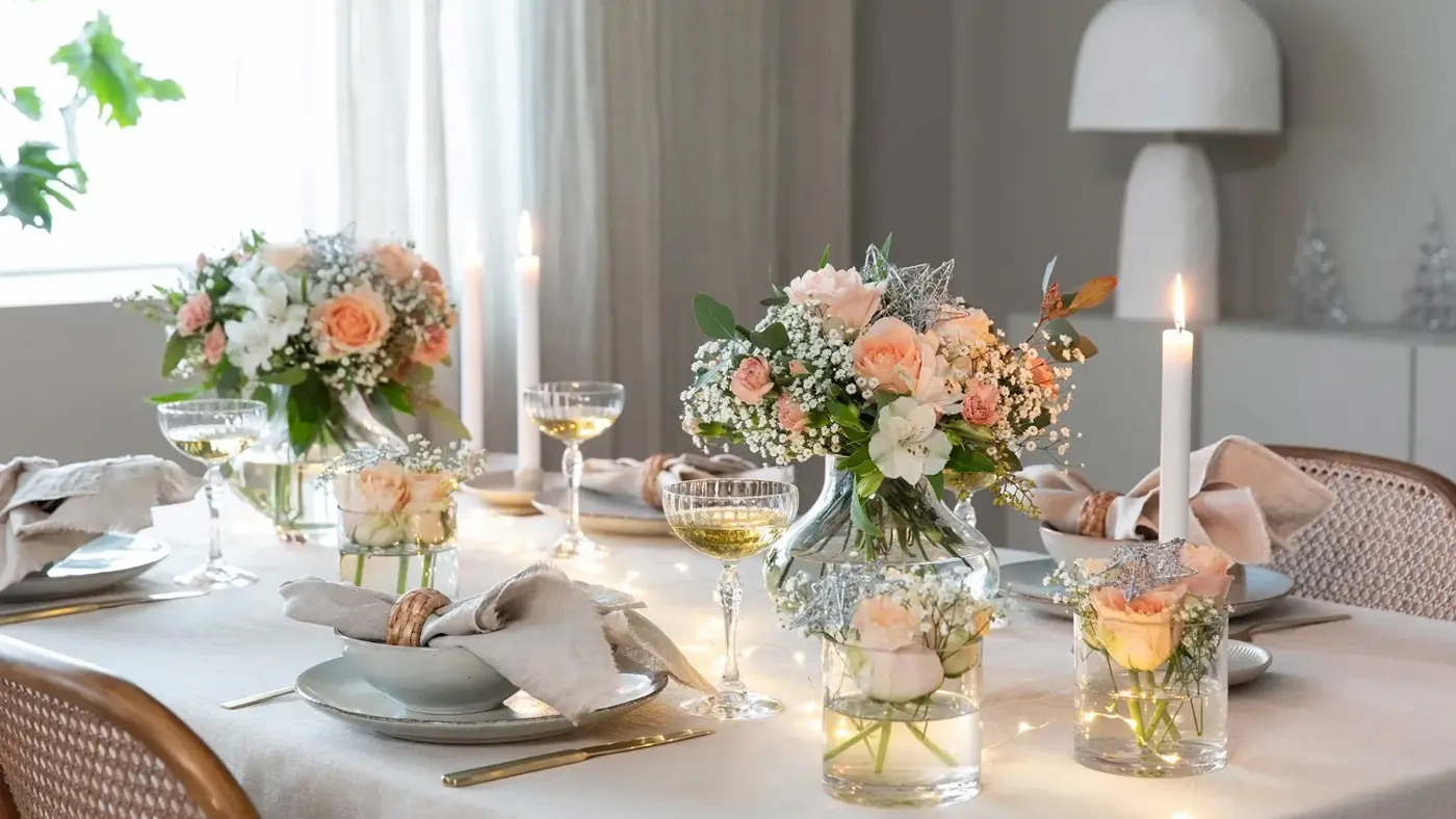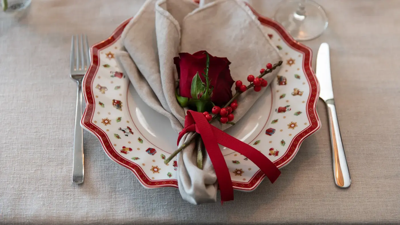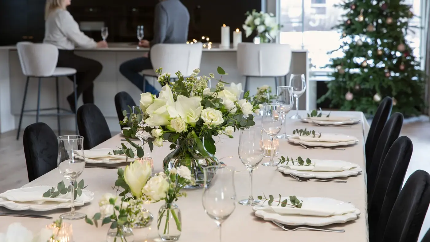Blomster og julepynt skaper en lun og hyggelig stemning ved bordet, så vær raus med blomster og lys. Det er lekkert å holde seg til en fargeskala. Rødt eller hvitt er favoritter til jul, mens hvitt og fersken passer ekstra fint til nyttår. Et godt tips er å pynte med lave blomsterbuketter eller dekorasjoner slik at gjestene ser hverandre over bordet. Du kan også bruke mange små vaser eller glass, og fylle med avskårne blomster og grener med sesongens grønt. Mellom vasene er det fint å pynte med både levende lys og lyslenker, da blir det ekstra stemningsfullt. Litt pynt på hver kuvert er prikken over i’en, og med alkoholfrie bobler kan alle ta del i skålen.