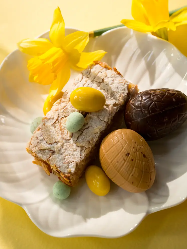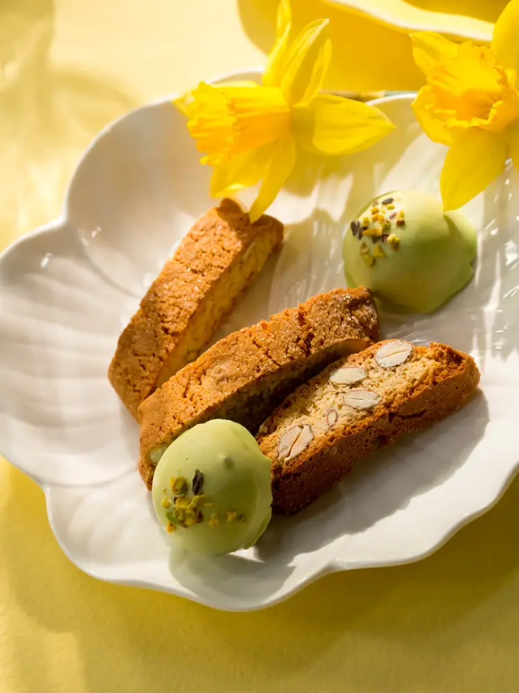 Alternativ til påskeegget? Søt avslutning på måltidet med biscotti og pistasjkonfekt fra Smak av Italia// Noe ekstra godt til kaffen? Kake og sjokolade-egg fra Kaffebrenneriet og gule egg med smak av pasjonsfrukt fra Tilbords. Den søte, hvite blomsterskålen er fra Tilbords.