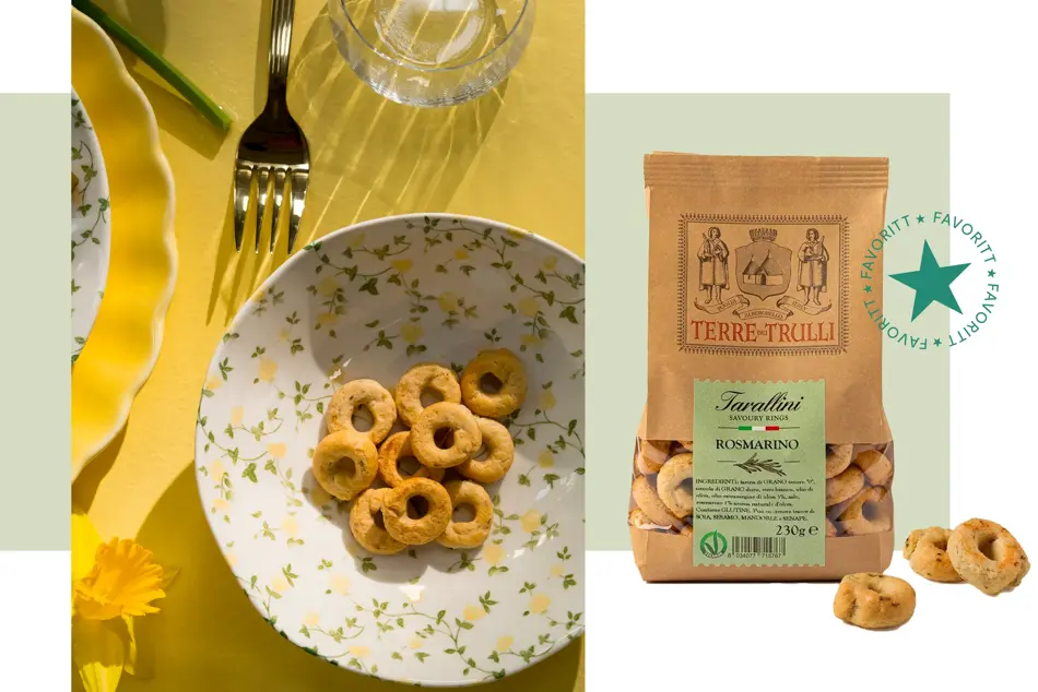 Mmm! Klassiske, små tarallini-kjeks fra Puglia med smak av rosmarin. Nyt dem som en del av et tapasbord med oliven og en god spekepølse, eller som en enkel snack. Du finner dem selvfølgelig på Smak av Italia.
