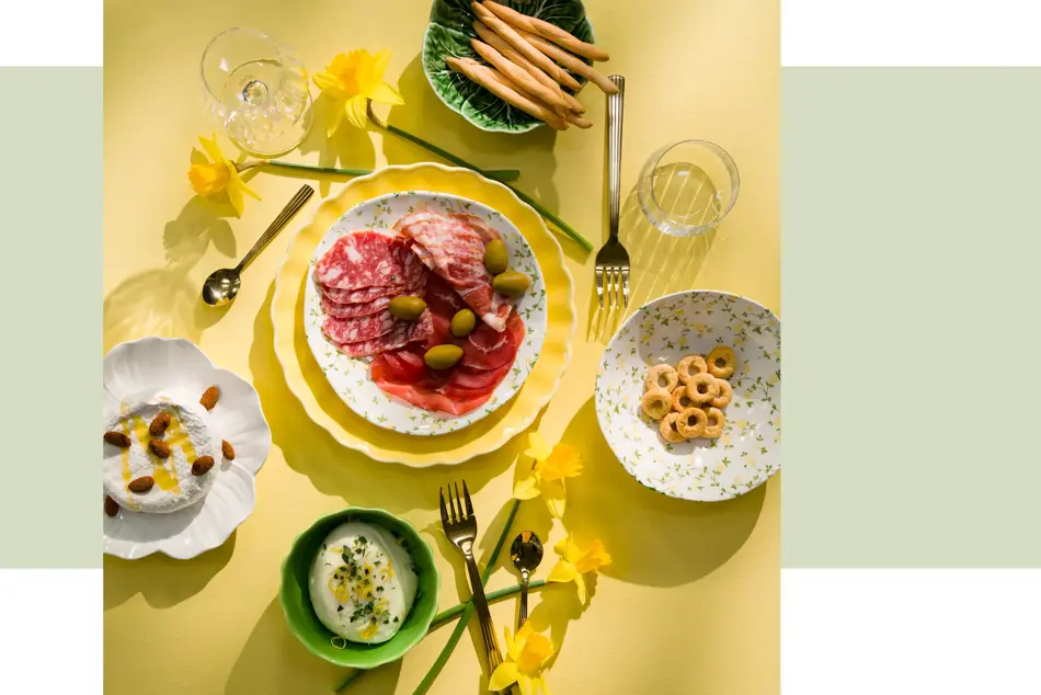 Påskelunsj eller en snack i sola? Hos Smak av Italia, som åpnet på Strømmen Storsenter i vinter, får du godsakene direkte fra Middelhavet. Her serverer vi camembert, burrata, pølser, skinker og grissini, på vårlig dekketøy fra Christiania Glasmagasin og Tilbords. Bestikket er fra Kitch’n.