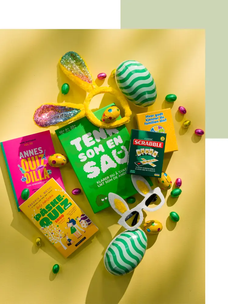 Hva med å prøve noen nye brettspill, eller arrangere påskenøtter i stua med quiz for hele familien? Rebusløp etter påskeegg er en sikker vinner, og legger du egg-jakten innendørs, er den helt uten værforbehold.