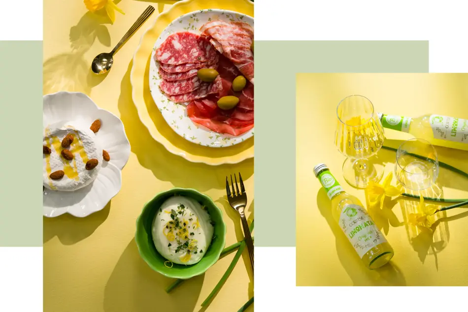 Perfekt påskebord: Spekepølser og digge oster fra Smak av Italia, på skåler og tallerkner fra Christiania Glasmagasin. Bestikket er fra Kitch’n, vin- og vannglassene fra Tilbords, og den økologiske limonata-brusen fra Smak av Italia.