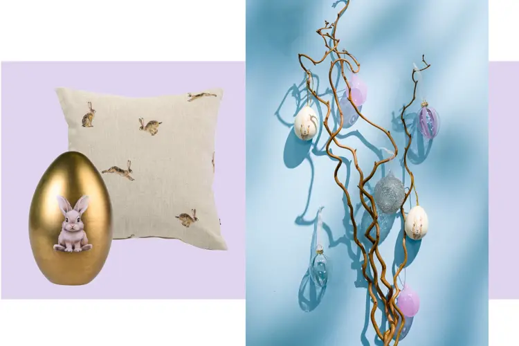 Ingen tvil om hva som er årets dille i påskepynten. Nå er harepusen (og kaninene) overalt! Pute, gullegg og dekoregg med hare fra Kid, og diverse glassegg fra Feel.