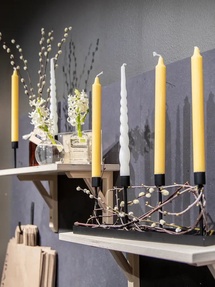 Kollega og butikkleder Cecilia er enig og ville også pyntet med den enklere påskedekoren Granit har å by på, som å bruke kvister til å dekorere lysestaken.