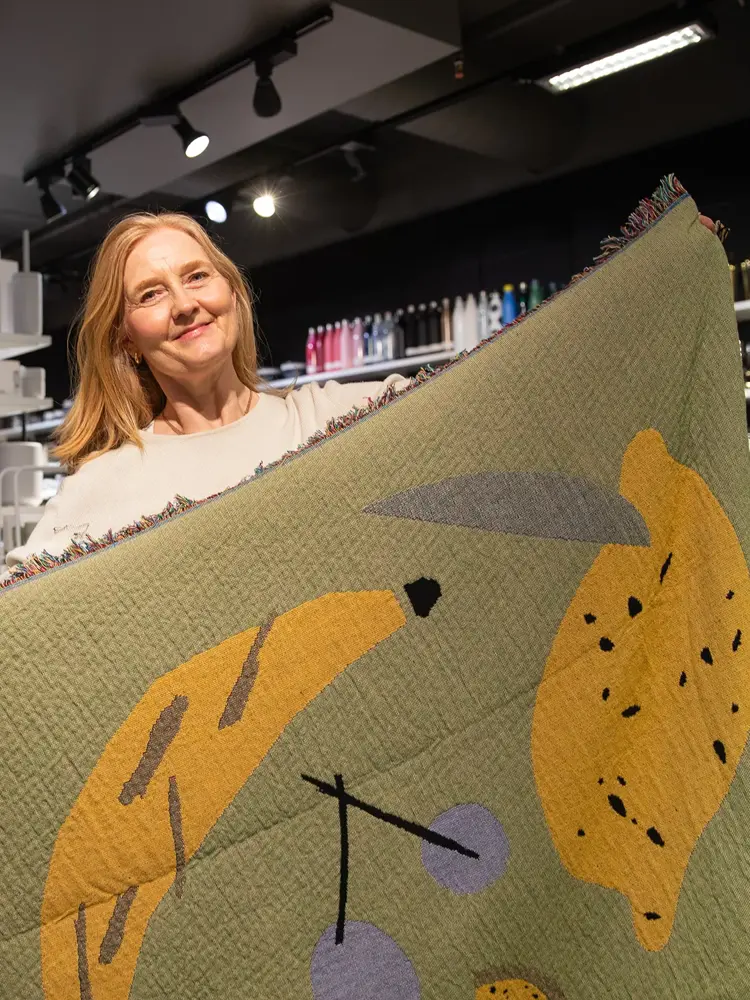 Pleddet med nydelig gul dekor fra Slowdown Studio minner også om påske og kan være midt i blinken på hytta i påskehøytiden, men også året rundt.